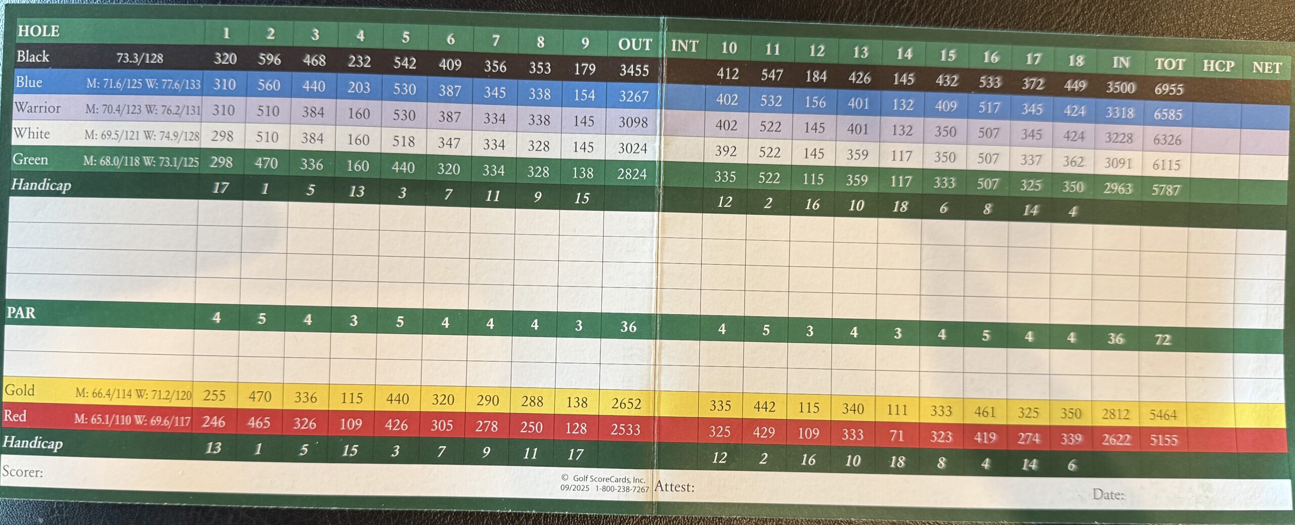 Tees – Playing Sixmile Creek Golf Course from the ‘the tips’ has always been a supreme golf challenge. The distance from our black tees is a deceptively challenging 6,955 yards. The golf course has a total of 7 sets of tees! At 6,585 the blue tees provide a great test for a low to mid handicap golfer. The